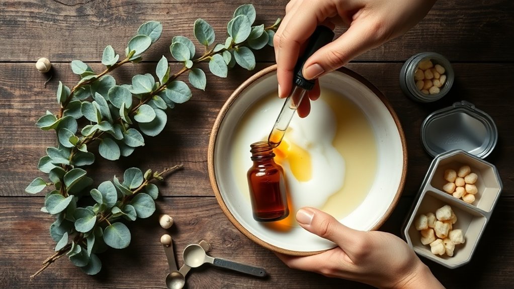 Once liquid, remove from heat and let cool slightly. Stir in eucalyptus essential oil gently, blending the aromatic vapor with carrier oils to preserve therapeutic properties.