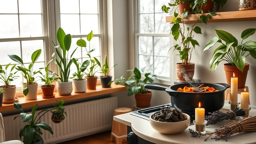 While HEPA filtration addresses particulate matter mechanically, thermal diffusion of botanical compounds offers complementary benefits for indoor air quality through volatile organic compound displacement. You’ll release antimicrobial terpenes by simmering eucalyptus, thyme, and rosemary—compounds that demonstrate verifiable antibacterial properties.