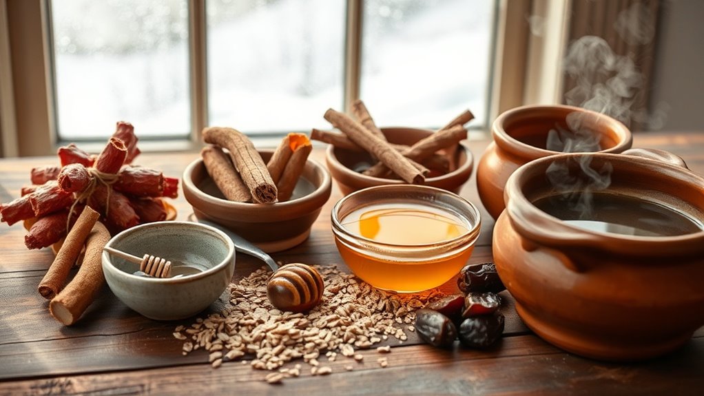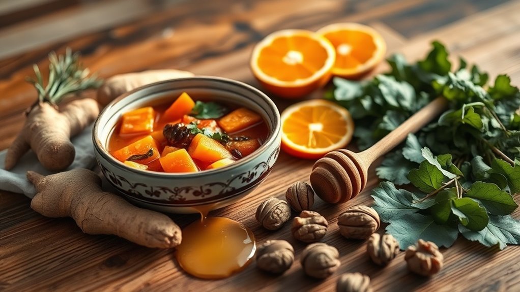 These tonics support white blood cell function and reduce oxidative stress through concentrated antioxidants. You’ll maximize nutrient preservation by using warm—not hot—water with fresh ingredients. Combine lemon with raw honey for antimicrobial benefits, or blend carrots, celery, apple, parsley, and lemon for thorough vitamin delivery. A ginger-citrus tonic mixed with raw honey provides antioxidants while improving circulation through ginger’s natural thermogenic properties. Consuming tonics on an empty stomach enhances absorption efficiency.